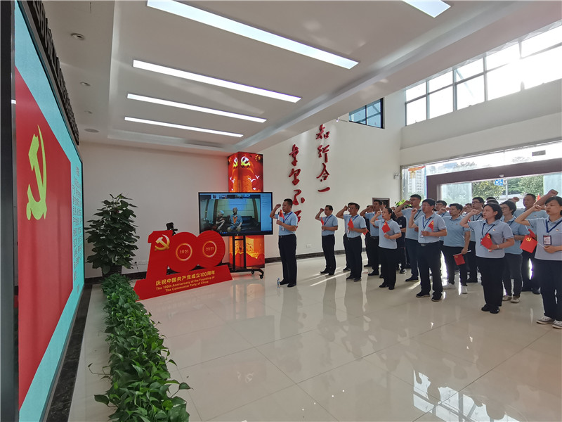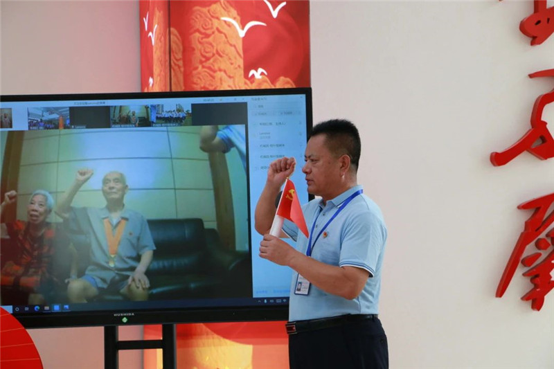 公司黨委書記王吉才領(lǐng)誓,機(jī)械院全體黨員重溫入黨誓詞,老黨員吳家修通過視頻連線同步重溫入黨誓詞。