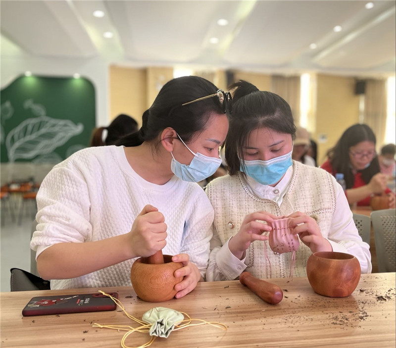 “吳茱萸芳香去濕、疏肝理氣,薄荷可以提神醒腦,大家隨身佩戴,可以在人體周圍形成高濃度的小環境......”在指導老師的解說中,女職工們一起認識了艾葉、薄荷、紫蘇、吳茱萸、花椒等草藥,以及每種草藥的獨特功效,并通過動手實踐,制香、聞香,更生動地認識藥用植物與養生知識、傳統文化的關聯。
